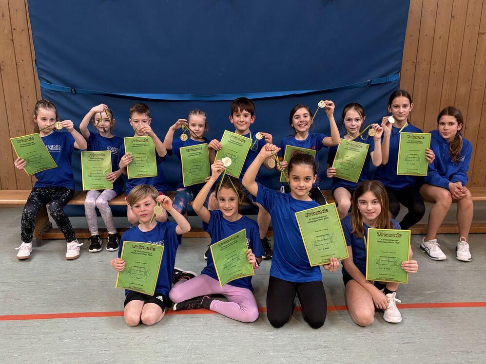 Bei den jüngsten Buben (M7) ging Jakob Zeilnhofer zu seinem ersten Wettkampf überhaupt an den Start. Er holte auf Anhieb Gold, wobei er mit 13,50 m den Miniheuler am weitesten in dieser Gruppe warf. In der Altersgruppe M9 schnitt Jonas Poruba am besten ab. Auch er freute sich über die Goldmedaille. Er war dabei in fast allen Disziplinen Bester. 29,50 m warf er den Miniheuler – mit Abstand der weiteste Wurf. Alexander Hamburg startete in der M 10 und holte die Bronze Medaille – seine Stärke war der Weitsprung mit 3,30 m. Wie immer waren mehr Mädchen als Jungs am Start. Jüngste Starterin (W7) war Elsa Cieslik, wobei ihr zum ersten Mal eine Weite von 8,50 m mit dem Miniheuler gelungen war. Auch sie konnte in ihrem ersten Wettkampf sich gleich die Goldmedaille umhängen. Wirbelwind Teodora Jovanovic nahm ebenfalls die Goldmedaille mit nach Hause. Sie war in ihrer Altersgruppe W8 die schnellste Läuferin über 30 m (6,0 sec). Melis Mehmed erreichte in der gleichen Altersgruppe Platz 6. Die Mädchen W9, Fiona Finsterer und Alicja Cieslik, sicherten sich Platz 11 und 14. Franziska Reiser ist fast immer in der Klasse W10 (Jahrgang 2016) die einzige Mainburger Starterin. Sie hat im größten Starterinnenfeld den siebten Platz im Mittelfeld der Altersgruppe erreicht. Die wettkampferfahrenen Mädchen (W11) vom Jahrgang 2015 platzierten sich hintereinander. Korina Jursic erreichte im Weitsprung 3,65 m und war insgesamt Silber-Medaillen Gewinnerin. Bronze ging an Elisa Habel. Ihr Weitsprung war nicht ganz so weit, allerdings gelang ihr ein Vortex Heuler- Wurf von 24,5 m. Anna-Lena Stanglmair verpasste nur knapp die Bronzemedaille und landete auf Platz 4.