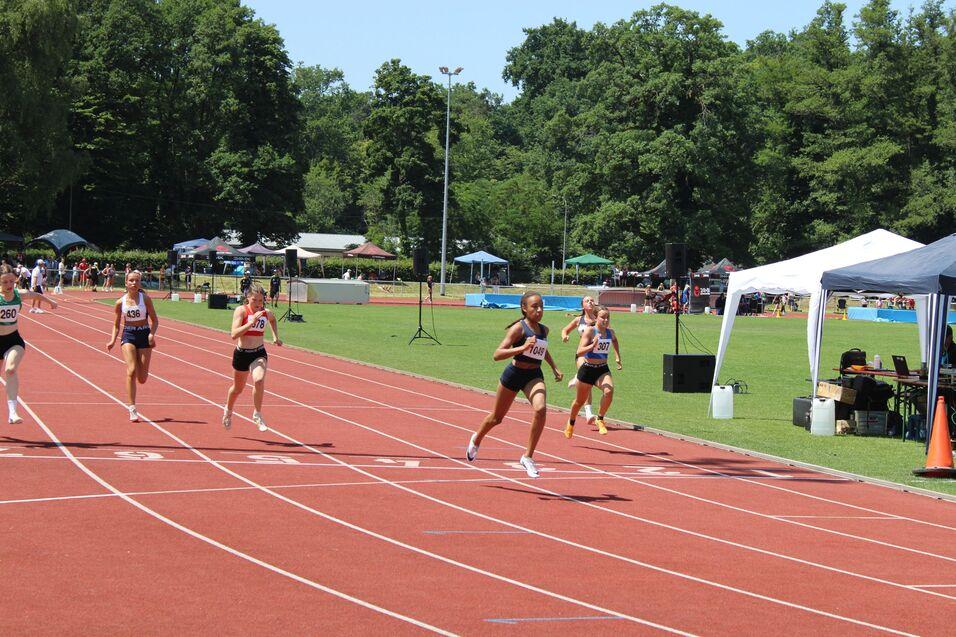 Die äußeren Bedingungen waren herausfordernd, nach 3 Wochen schlechtem Wetter stieg das Thermometer auf 33°C. Hannah und Julia nahmen bei den U14 bei 75m und 800m und bei den U16 bei 100m teil, Max und Benedikt bei den M11 bei 50m und Weitsprung.
