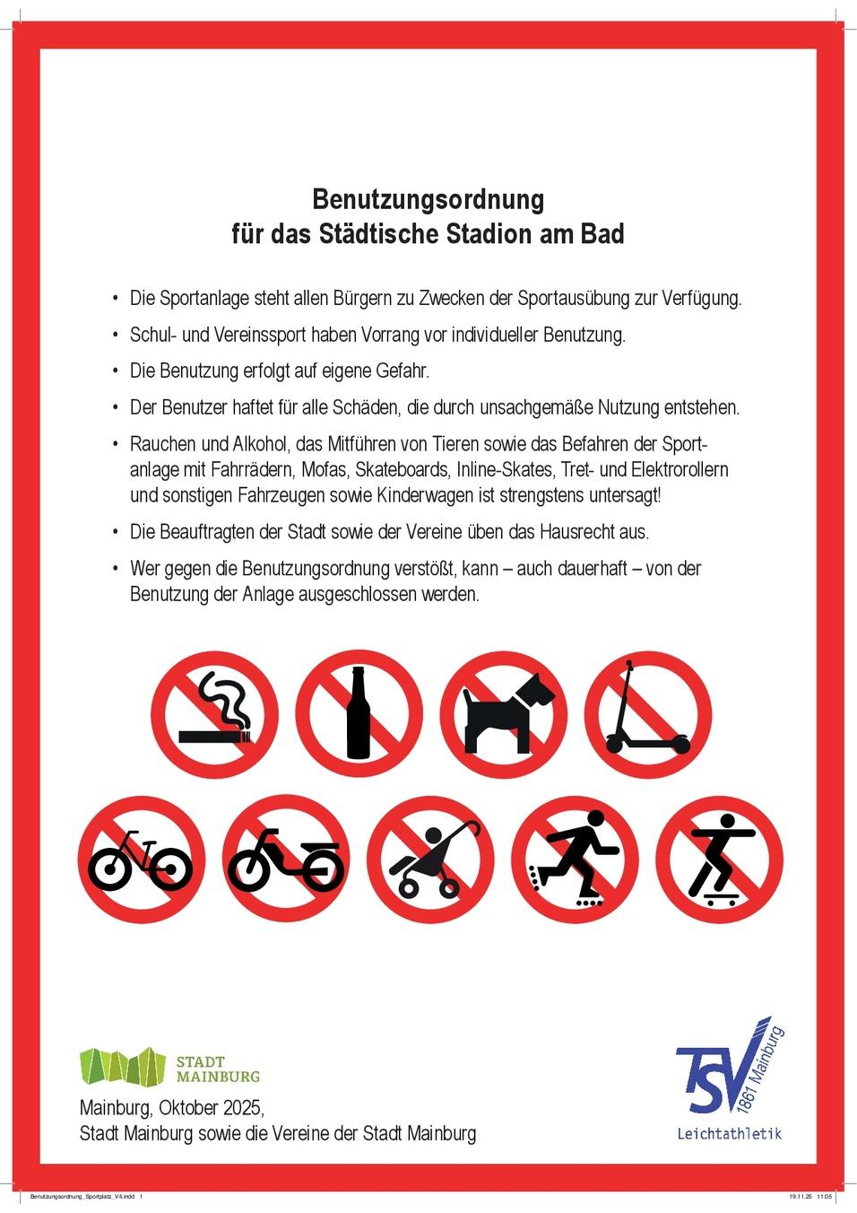 Nun wurden unter Regie der Leichtathletikabteilung des TSV, in Absprache mit dem Bauamt der Stadt Mainburg im Auftrag des 1. Bürgermeisters Helmut Fichtner die Nutzungsregeln auf Tafeln mit Piktogrammen dargestellt und an den Zugangsmöglichkeiten montiert. Dank der neuen, unmissverständlichen Beschilderung können sie Nutzer nun direkt und fundiert auf die geltenden Regeln hinweisen, um ein respektvolles Miteinander auf dem Sportgelände zu gewährleisten. Dabei handelt es sich ausdrücklich nicht um neue Vorschriften. Die rechtlich bindende Stadionordnung ist weiterhin wie gewohnt als Textaushang im Bereich der Treppe zum Innenraum zu finden. Da diese jedoch im Alltag oft übersehen, bzw. nicht beachtet wird, fungieren die neuen Schilder nun als visuelle Unterstützung