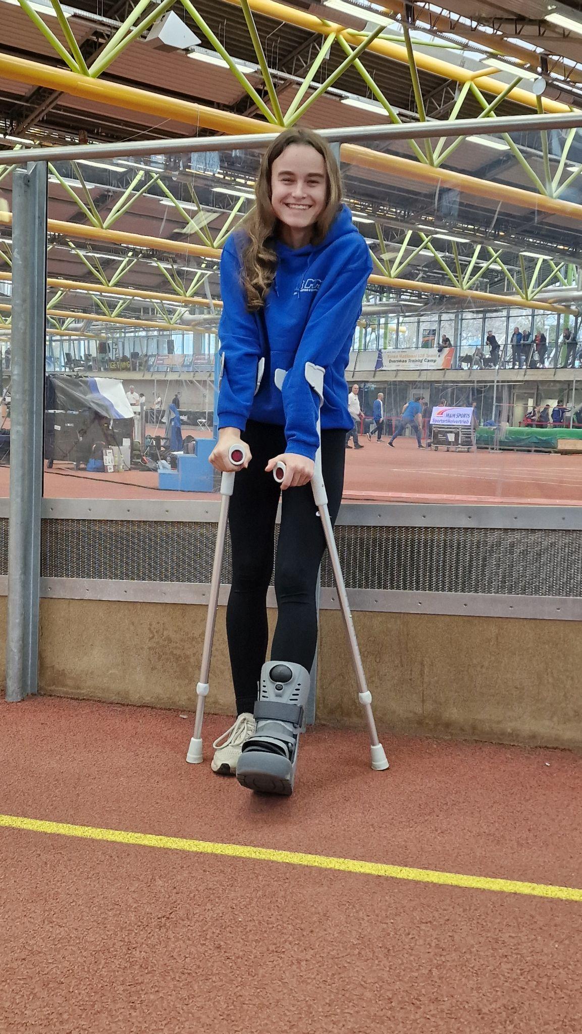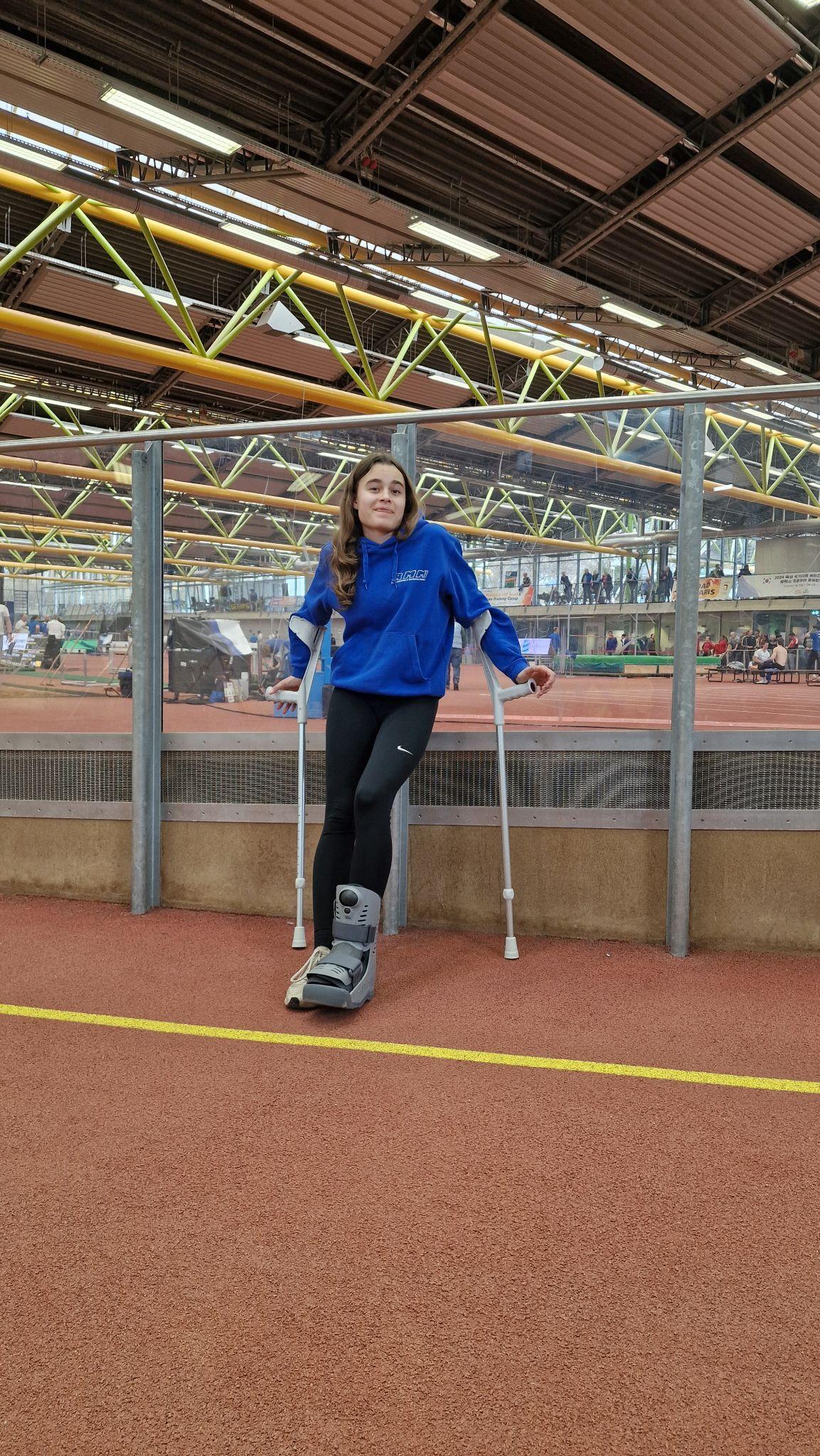 - 2 Mainburger Leichtathletinnen mit Maskottchen beim Munich Indoor