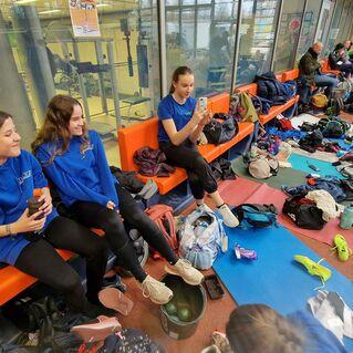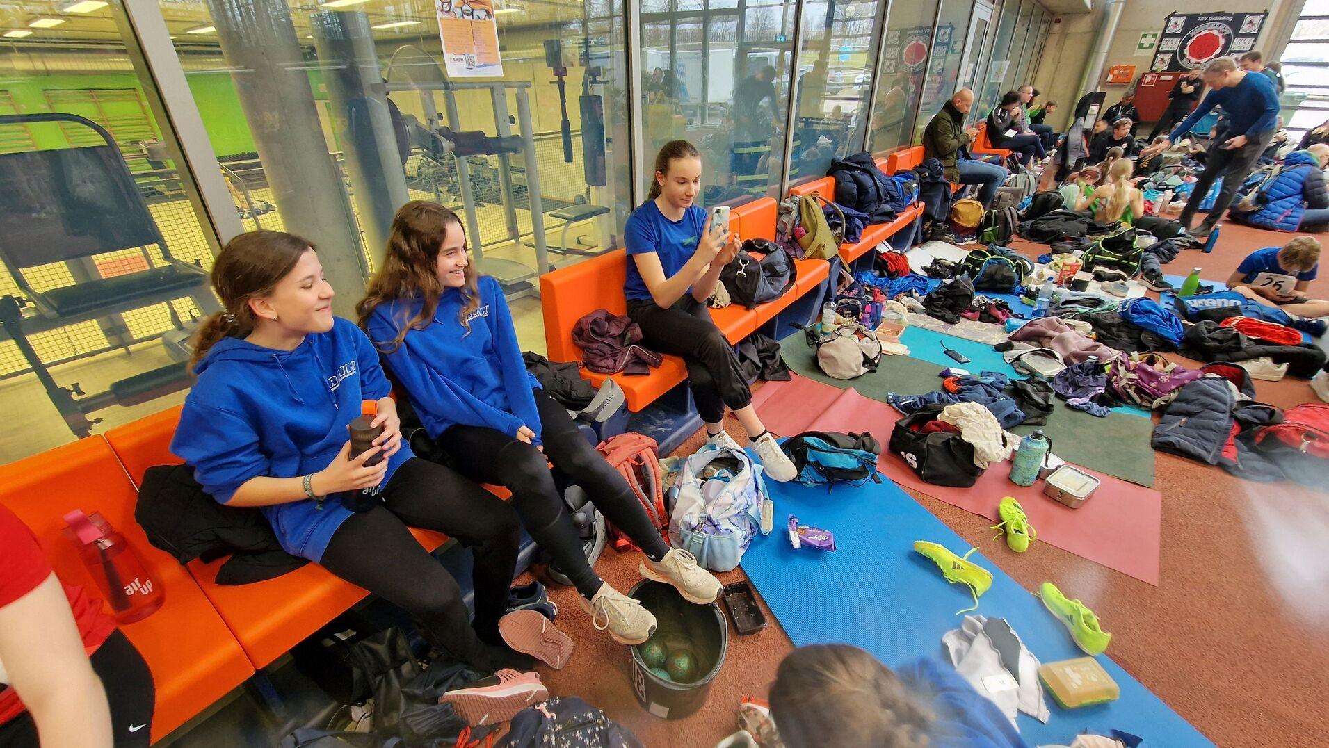 - 2 Mainburger Leichtathletinnen mit Maskottchen beim Munich Indoor